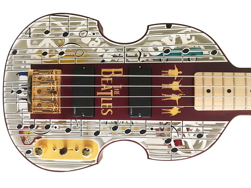 The Beatlemania 3D printed bass guitar: Themed off of Paul McCartney's iconic Hofner violin shaped bass guitar, the front panel is made up with the score for 'Yesterday' and the inside contains various Beatles era related icons (Yellow submarine, Sgt Peppers lonely hearts club band drum kit, George Harrison's Rickenbacker guitar, John Lennon's glasses, the iconic Abbey Road scene, etc.