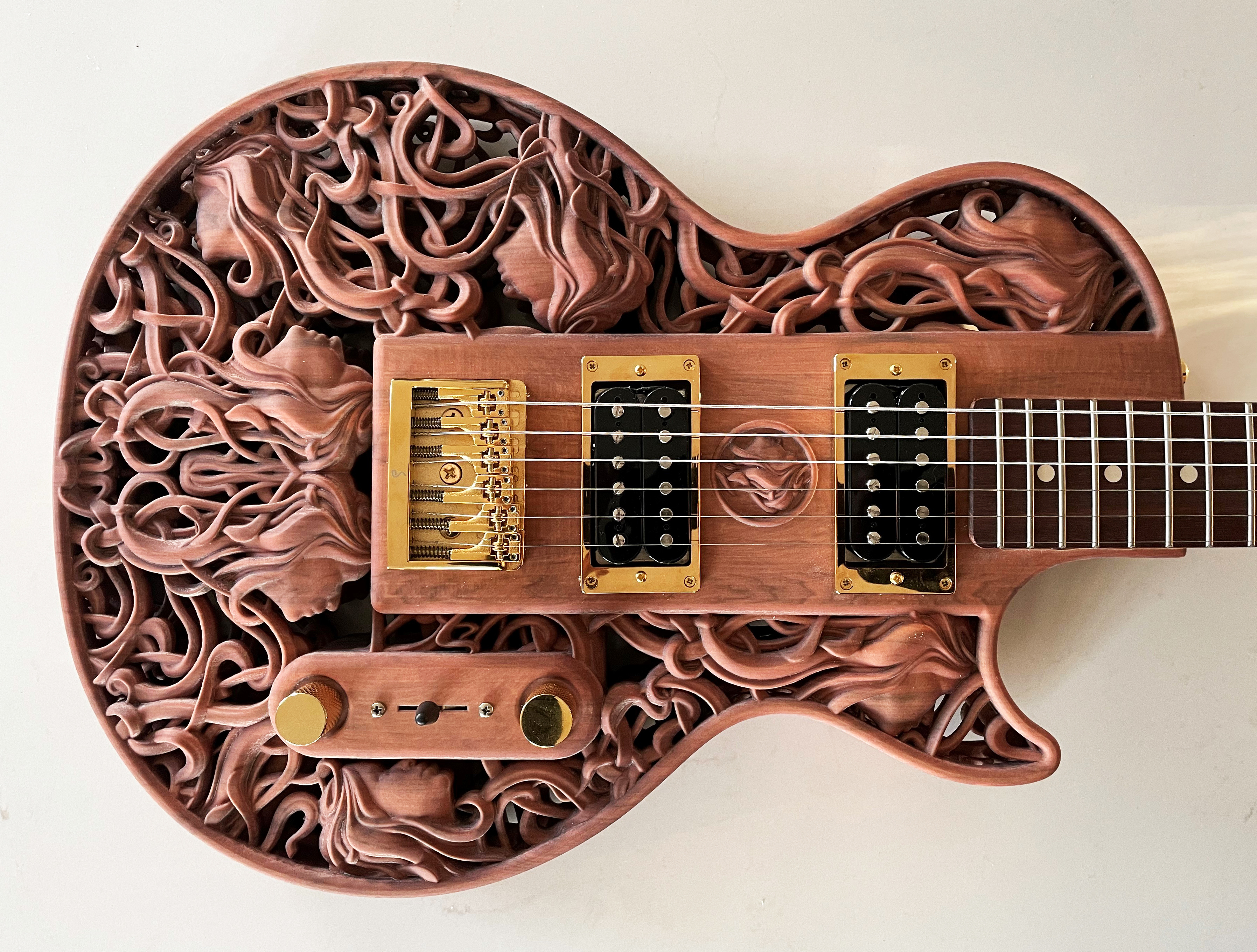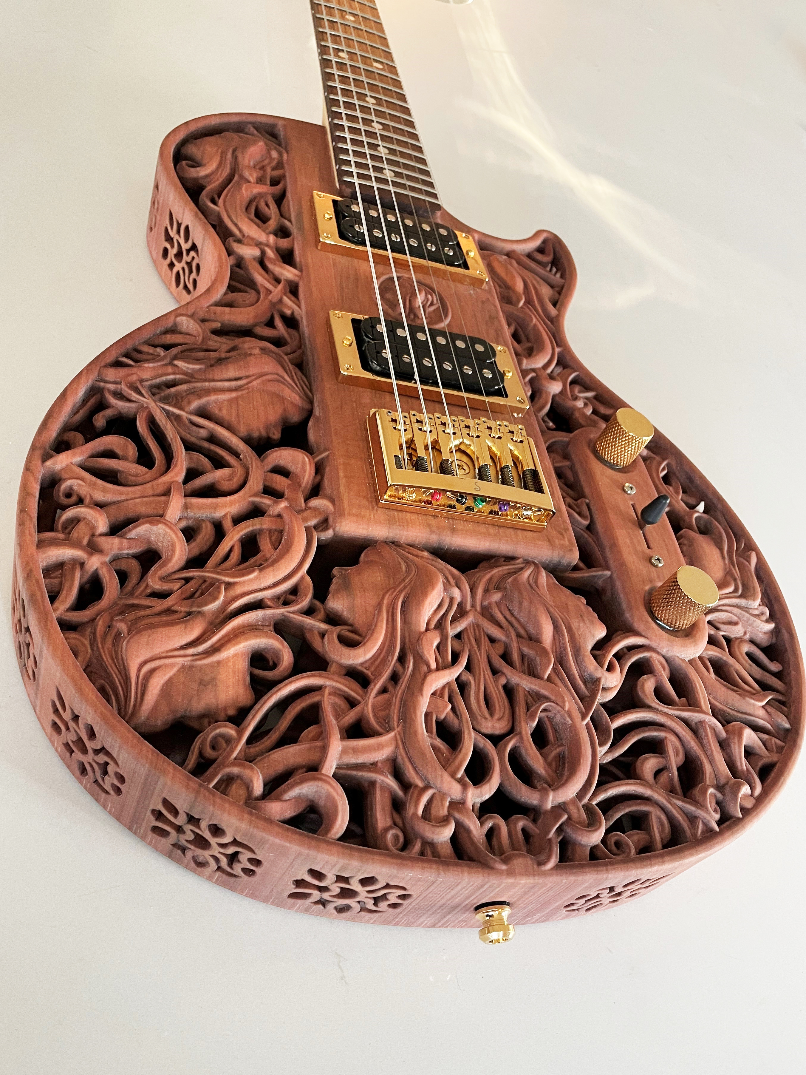 Boy, have my carving skills improved! Meet Gaia, my latest guitar creation. It’s made of rare New Zealand pseudonium wood that was air-dried for 10 years by the warm breath of Vestal virgins and can only be carved on a moonlit night. 🤣