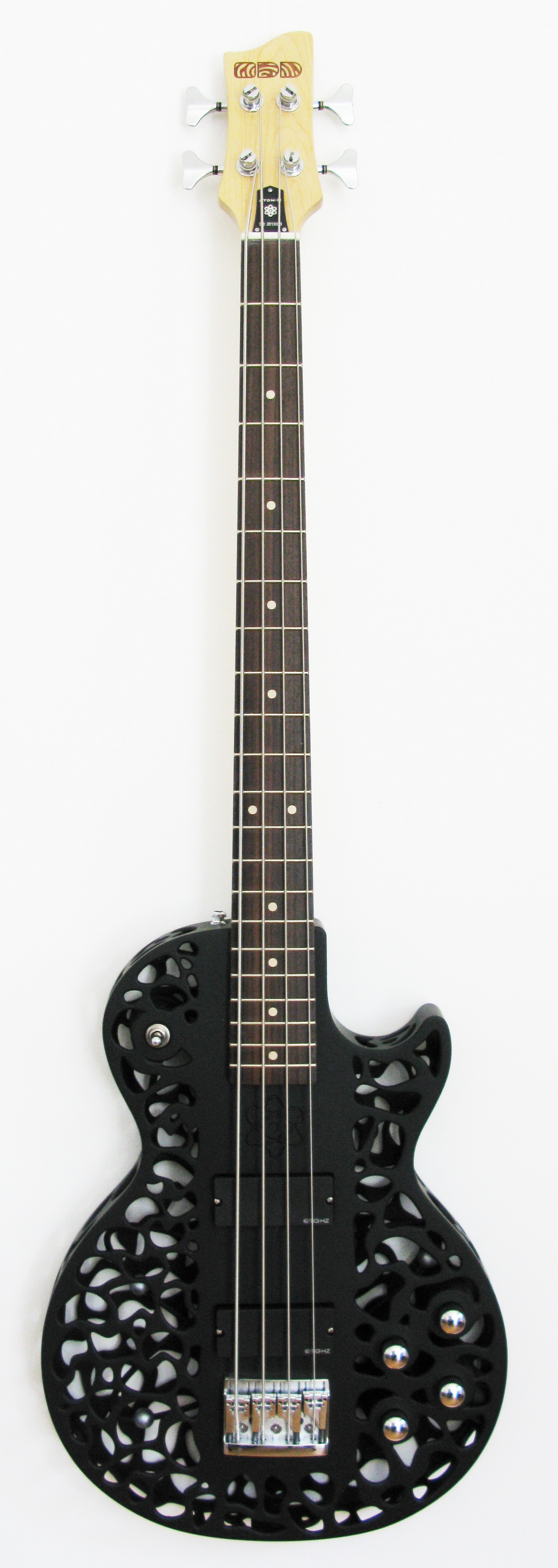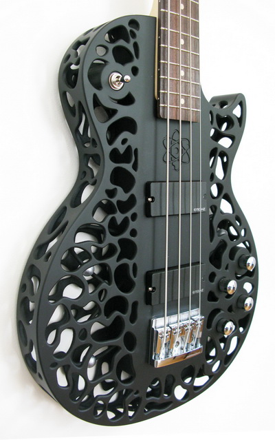 The Atom 3D printed bass guitar: A Les Paul inspired bass guitar with an internal atom with spinning electrons. The bodies are printed, using Selective Laser Sintering, by 3D Systems in the USA, on an sPro 230 SLS system. The material being used for these guitars is Duraform PA which is a very strong form of Nylon. The resolution for the prints was 0.1mm (which means that each layer that makes up the guitar body is 0.1mm thick). The guitars feature a wooden inner core (choices of Mahogany or Maple, etc.) that links the neck to the bridge, which allows us to customize the sustain and tone of the instrument to suit the musician, and a number of options for hardware, etc.