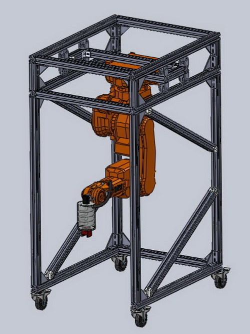 The frame for the 3D printer was built out of standard aluminium extrusion, and includes a removable bottom front linkage to make the frame completely rigid during transport, but allows extra reach to the robot when it is removed.