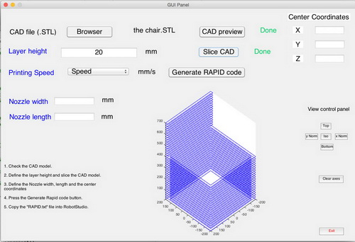 The software developed for the 3D printer processes the design to printed and translates it into the robot language. It tells the robot what to do in order to create what has been designed. It first uses MATLAB to slice up the CAD design, from an STL file, as a normal 3D printer would, but then translates that into RAPID code, as is required to control the ABB IRB 140 robot. It also uses another algorithm to keep a continuous flow of concrete during the print. This is important to guarantee a good quality print and get good mechanical properties for the concrete.