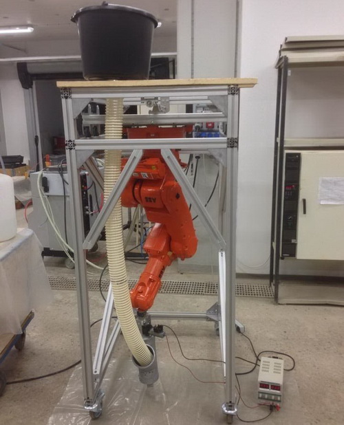 And the assembled printer with a pipe feeding concrete to the print-head: