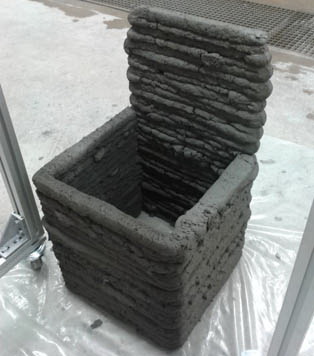 The proof-of-concept printer successfully printed the objects shown below. Future work includes improving the concrete feeding system, adding paddles to smooth the objects being printed, maybe replace the robot arm wiht a gantry type system to allow bigger prints, etc. This is an on-going project, so stay tuned to see what the next students come up with.