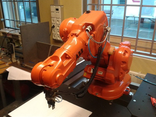 A brief was given to two Masters students, Borja Serra and Lars Henrik Anell, to transform the ABB IRB140 robot into a mobile 3D printer capable of printing street furniture, or public art works, in concrete. They divided up the work into two sub-projects, with Borja taking care of the 3D printer frame design, and the software and programming of the robot, and Henrik taking care of the design and construction of the concrete print-head. Here is some of what they came up with: