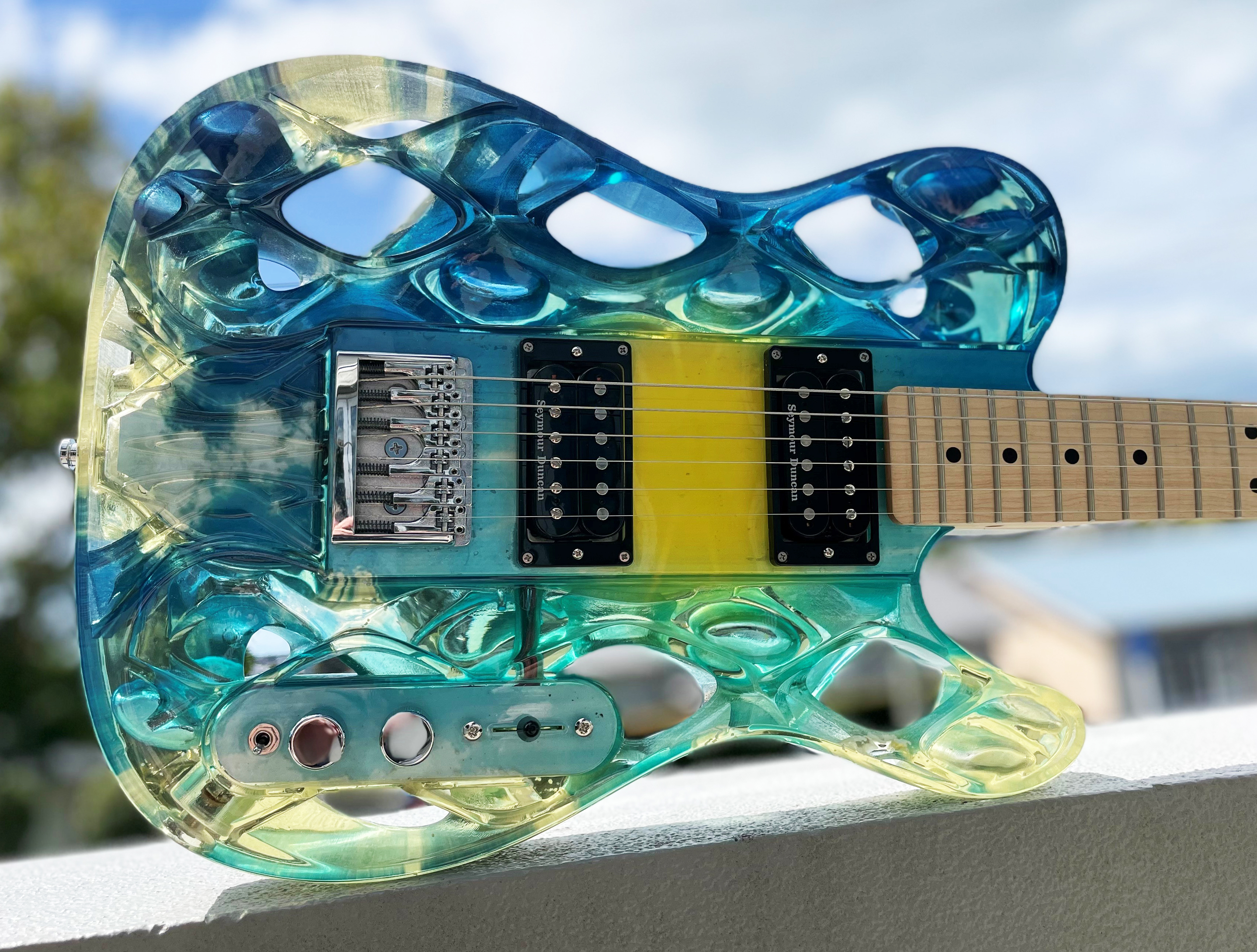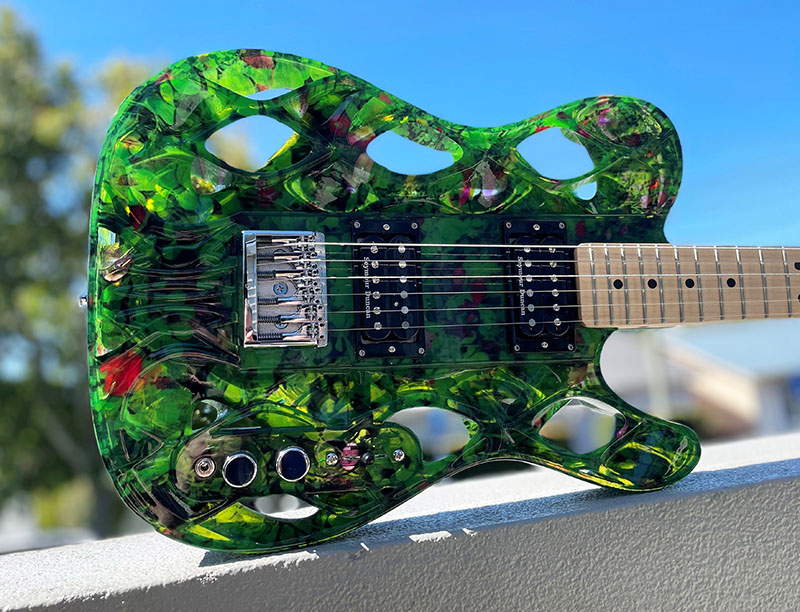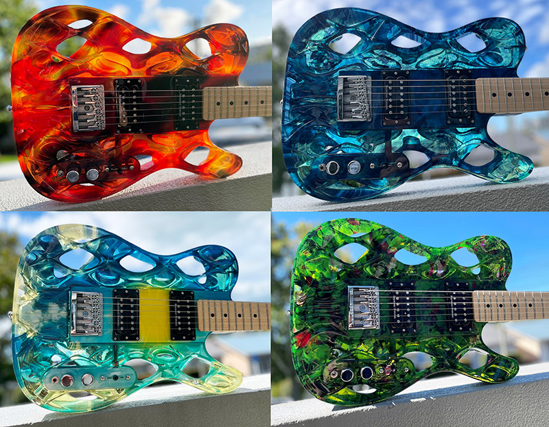 Here’s the complete four-elements collection of 3D printed guitars: Fire, Water, Air and Earth. The guitar bodies are 3D printed in full-colour translucent acrylic, And, of course, each has LEDs that light up to suit their element on the inside to go with the gloriously kitsch theme!