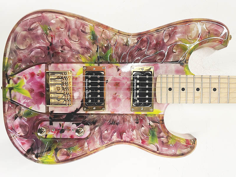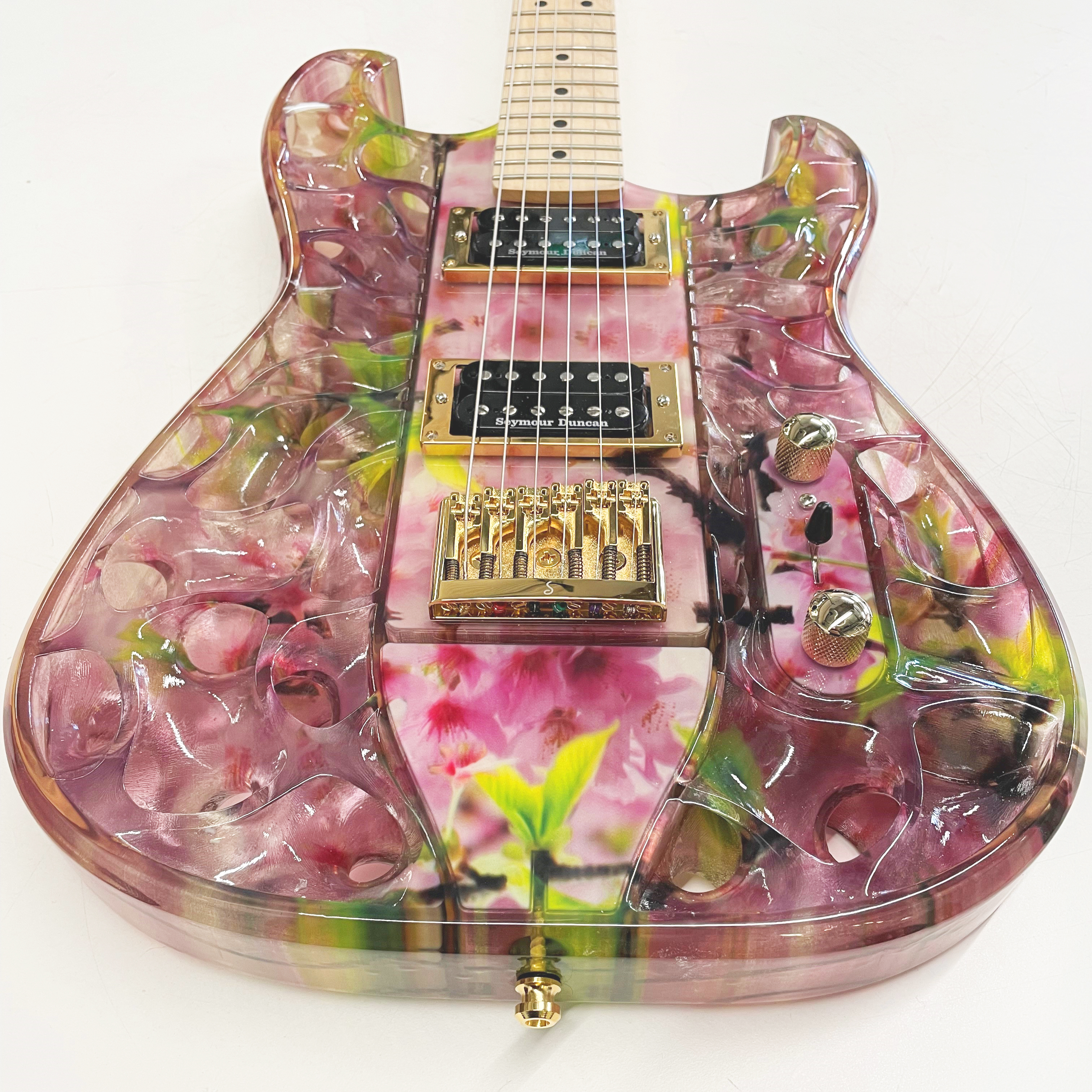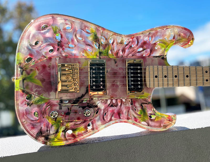 Just in time for cherry blossom season! Meet Sakura, the latest in my collection of 3D-printed guitars. This one is inspired by Hanami, the Japanese cherry blossom viewing festivals. It, of course, has LEDs inside the guitar that cascade down in pink and white sparkles, like cherry blossom petals falling from the tree.