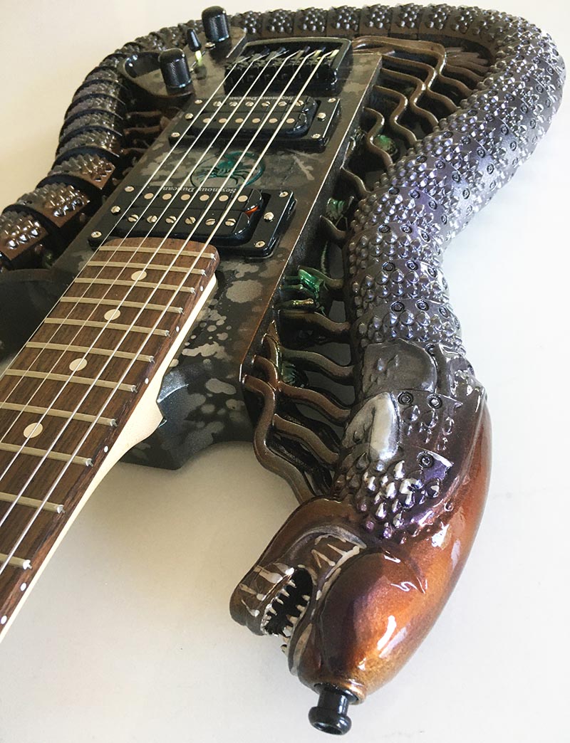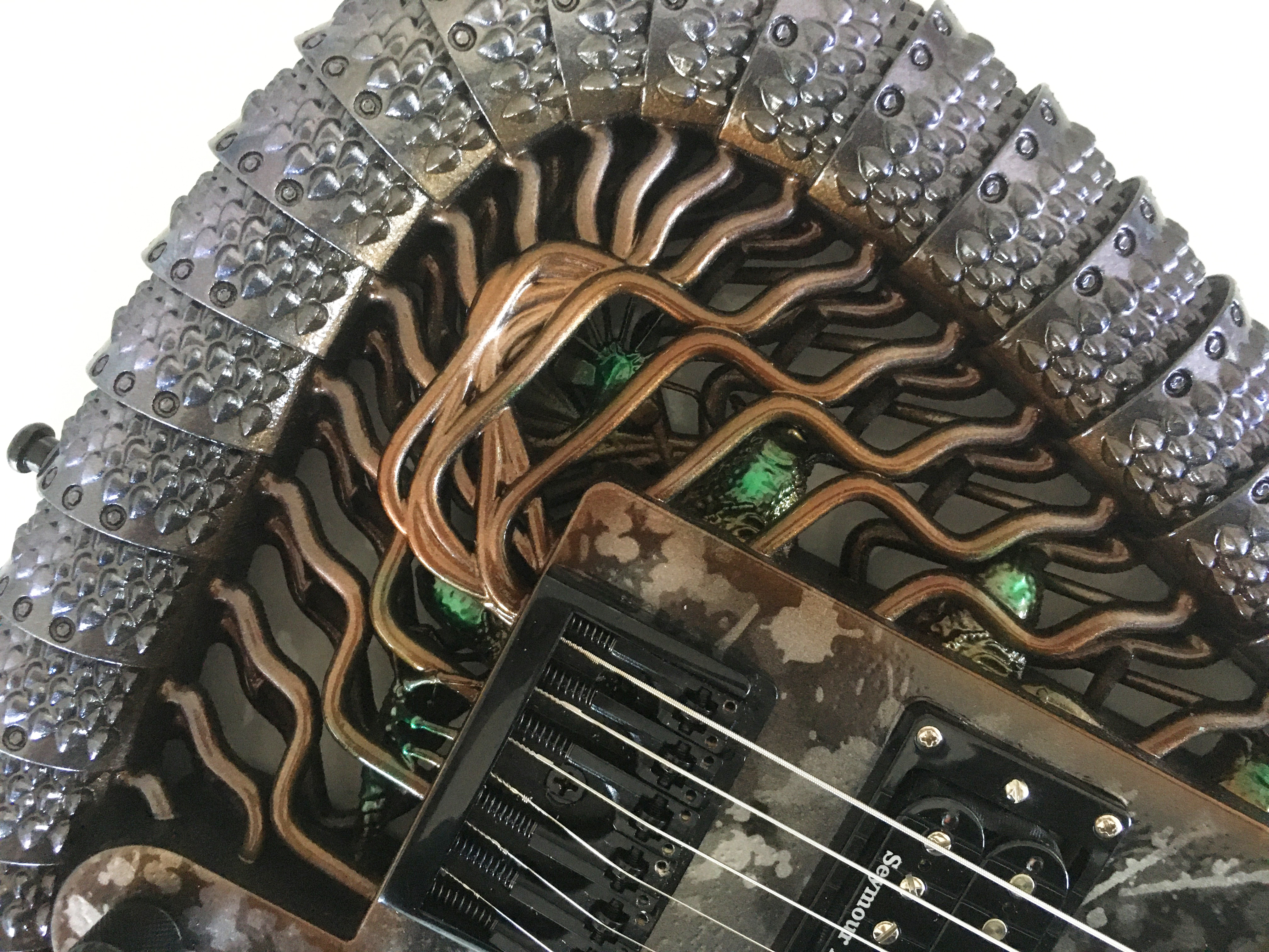 The paint-job was done by awesome NZ air-brush artist Ron van Dam. Printed in nylon using SLS, by Materialise, with a wooden maple inner core, and a maple/rosewood Warmoth neck. The hardware includes Seymour Duncan hot-rodded pickups, a Schaller bridge and Gotoh tuners, all in black for that mean look, of course.